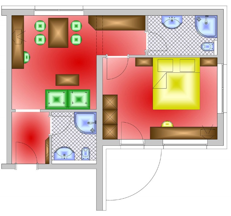 Appartement B verfügt über zwei Badezimmer mit Dusche und WC, ein geräumiges Schlafzimmer mit TV und Safe, sowie einen großen Wohnschlafraum mit Kochecke inklusive Geschirrspüler und Mikrowelle, eine gemütliche Sitzecke, eine große Couch und einen Fernseher.